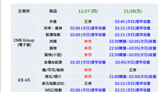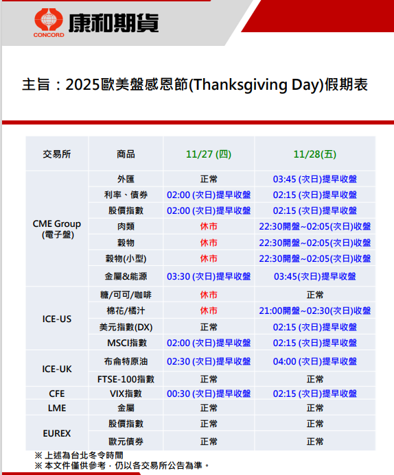 2025年歐美盤感恩節假期表