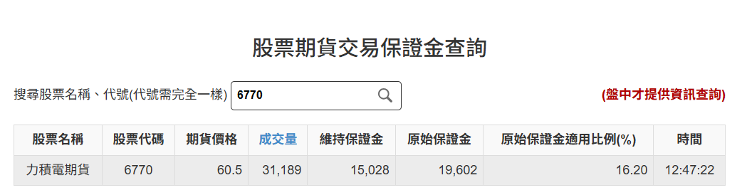 舉例:假設買進一口力積電期貨成交價65元,當維持保證金低於65乘2000乘12.42%=16146元時就會收到追繳通知。